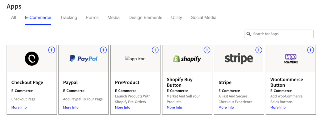 | E-Commerce(eコマース / ネット通販) | Checkout Page, Paypal, Shopify Buy Button, Stripe, WooCommerce Button |