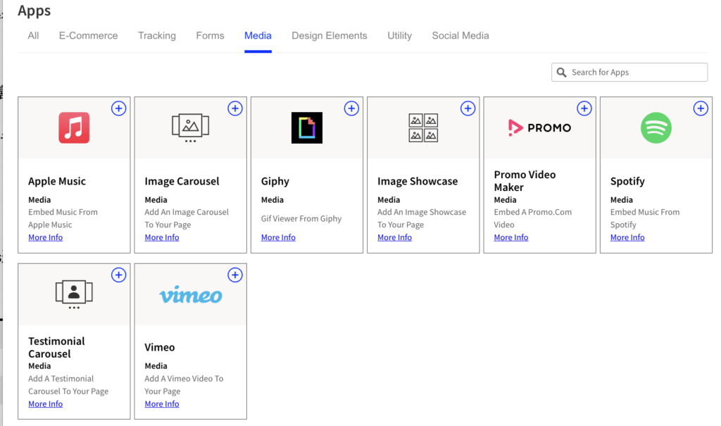| Media(メディア) | Apple Music, Giphy, Spotify, Vimeo, Promo Video Maker, Image Carousel, Testimonial Carousel |