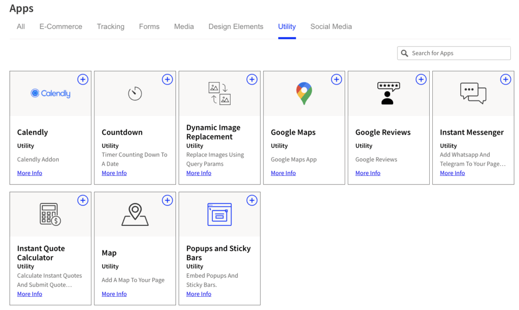 | Utility(ユーティリティ / 便利ツール) | Calendly, Countdown, Google Maps, Instant Messenger, Popups and Sticky Bars, Instant Quote Calculator |