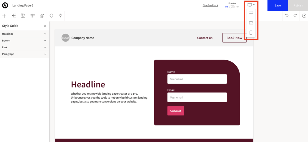1. ビルダー内の表示切替: Unbounceのビルダー画面上部にあるデスクトップアイコンとモバイルアイコンを切り替えます。