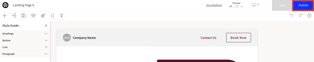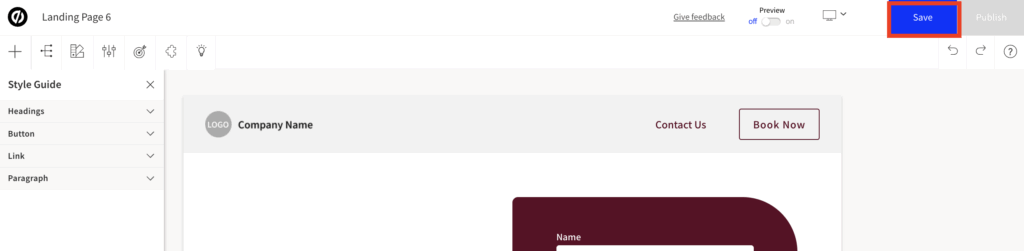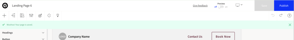 保存方法:ビルダーに入り画面右上の「Save」をクリックし、LPを保存します。緑色のポップアップが表示されると保存完了です。