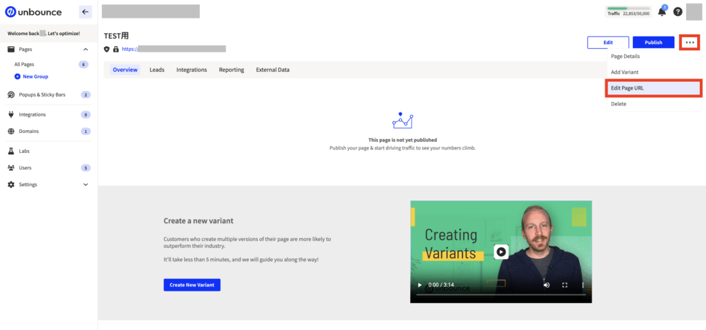 - LPのダッシュボードで、「A/B Test」または「Variants」セクションに進みます。