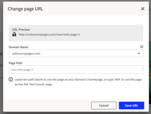 2.「Domain Name」のプルダウンから「unbouncepage.com」を選択すると、URL Previewの部分にテスト用のURLが発行されるので、確認後、Save URLを選択。