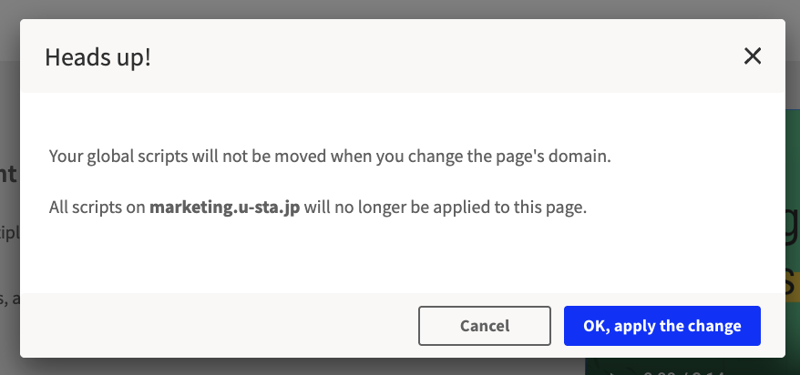 3. ポップアップが表示されます。こちらは「ドメインを変更してもグローバルスクリプトは自動で引き継がれません。」といった内容になります。問題なければ「OK」を選択。