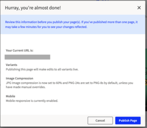 3. ポップアップが表示されます。各種設定(現在のURL、バリアント(Variants)、画像圧縮(Image Compression)、モバイル(Mobile))の内容が表示されるので問題なければ、「Publish Pages」ボタンをクリックします。