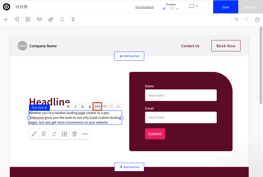 1.Unbounceビルダーで、動的に変更したいテキストを選択し、「DTR」アイコンを選択します。