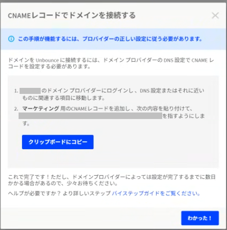 3.Unbounceが提供するDNSレコード情報(CNAMEレコードなど)をコピーします。