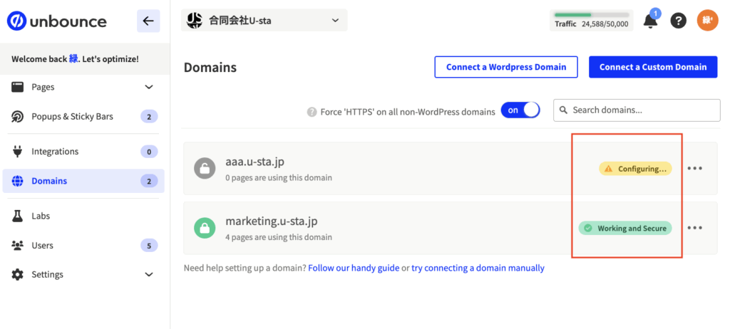 5.DNSの反映には数時間~最大48時間かかることがあります。反映後、Unbounceダッシュボードでドメインの接続ステータスが緑色の「Working and Secure」になれば完了です。