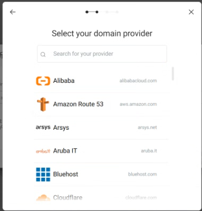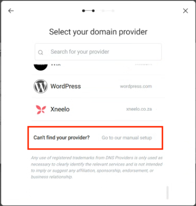 4.ご自身が利用しているドメイン管理サービス(お名前.com、ムームードメインなど)を選択。ない場合は「Can’t find your provider?」を選択して入力。