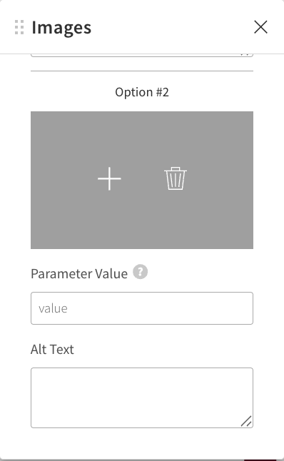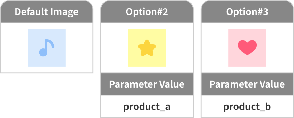 • Parameter Value(パラメーター値):URLのクエリパラメータ(例: ?image= の = の後に続く値)と完全に一致させる値を入力します。この値がURLから渡されると、対応するオプション画像が表示されます。