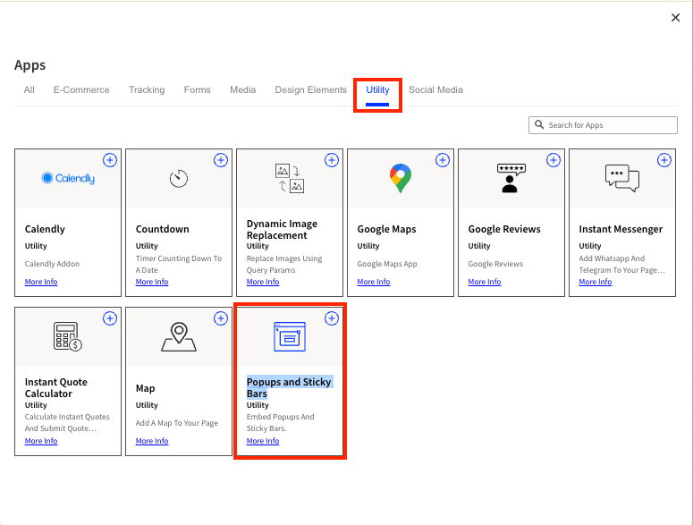 2.上部メニューから「Utility」を選択し、「Popups and Sticky Bars」ボタン内の+を選択。選択後にコードコピー用のポップアップが表示されますが、後ほど設定するので一旦閉じて大丈夫です。