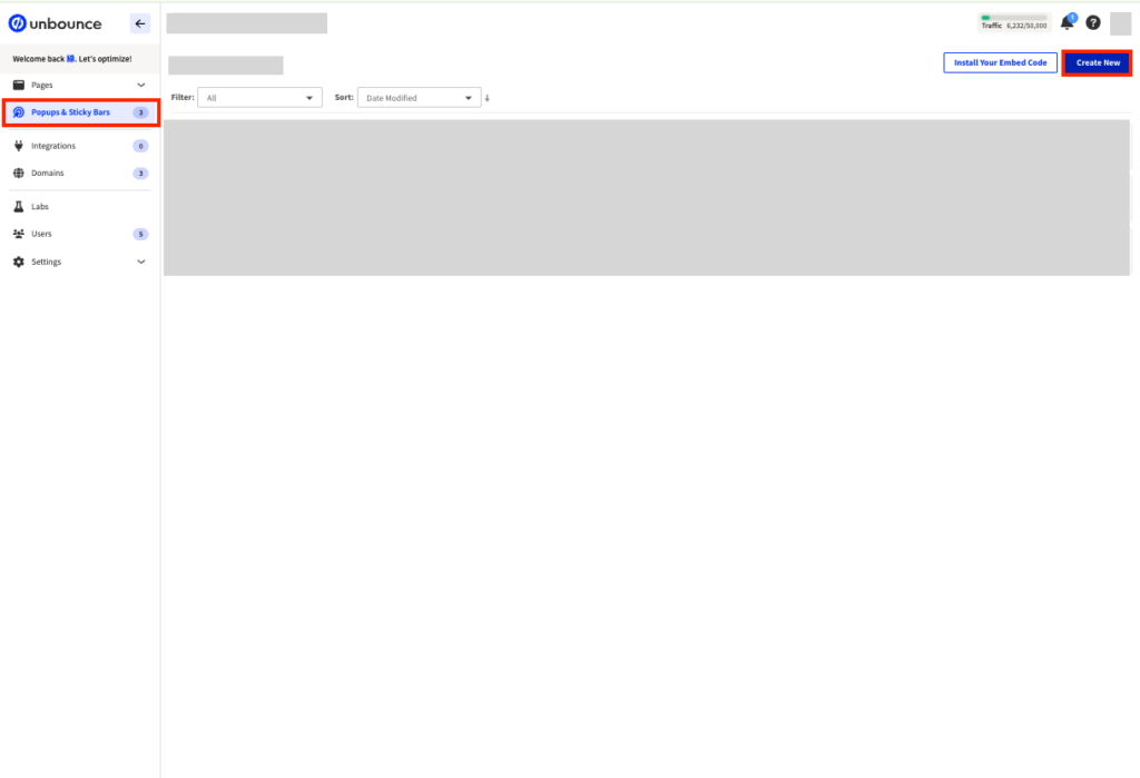 3.Unbounceのダッシュボードに戻り、左側のナビゲーションから「Popups & Sticky Bars」を選択し、右上の「Create New」を選択します。