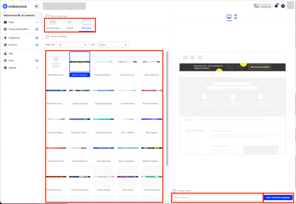 •  Pick a content type:「Popups(ポップアップ)」「Sticky Bars(スティッキーバー)」のどちらか設置したいものを選択(今回はSticky Barsを例に説明します。)