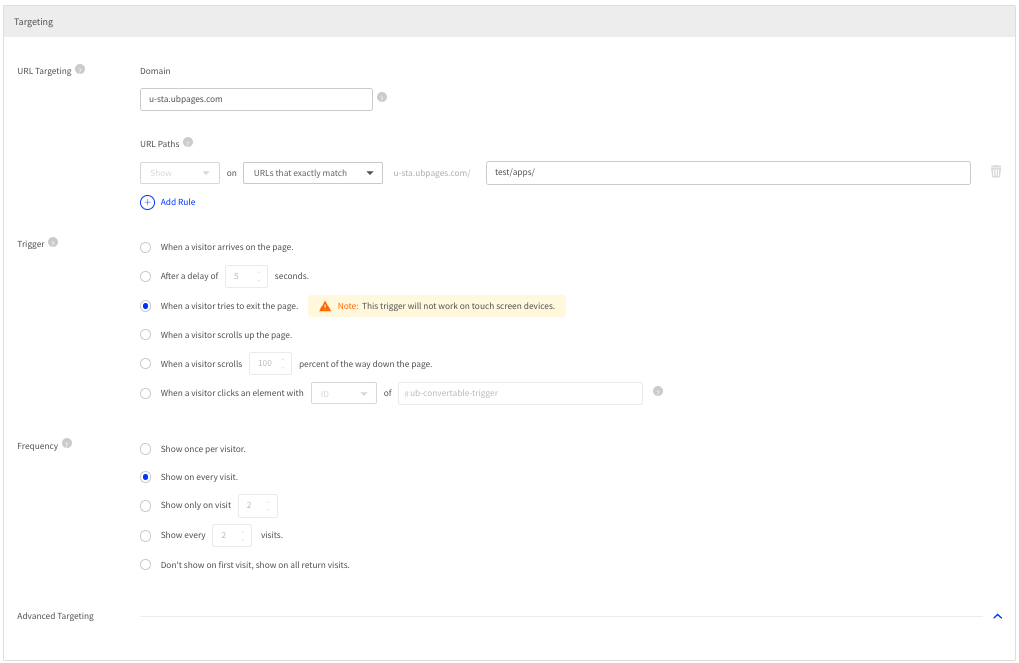 ページ閲覧中に「ポップアップ」や、画面上下に常駐する「スティッキーバー」を表示させます。トリガー(表示タイミング)も細かく設定可能です。