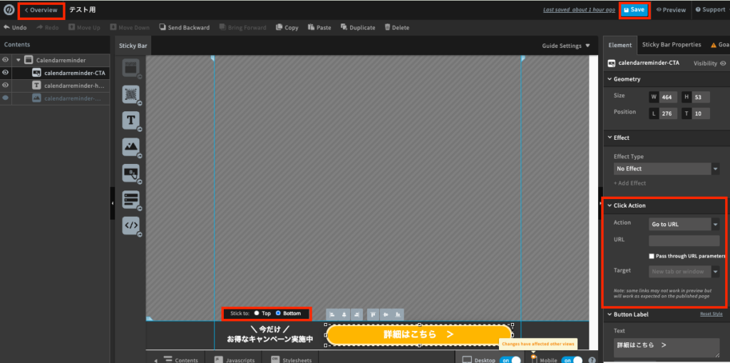 5.編集画面に移るので、テキストや色味、レイアウト等のデザインの調整とCTAの遷移先URLを設定し、右上の「Save」を選択し、左上の「Over view」から設定画面に、戻ります。